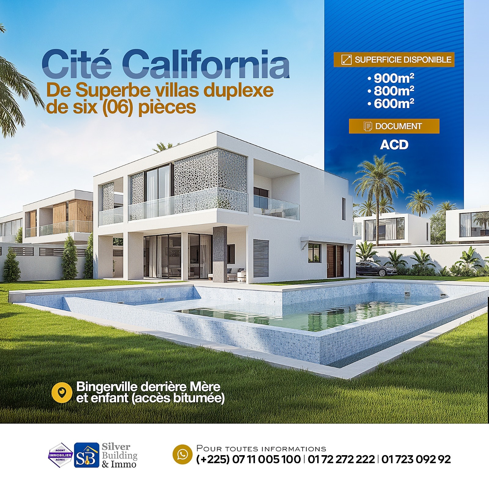 Située à Bingerville, juste derrière l’hôpital Mère-Enfant, la Cité California vous offre un cadre résidentiel moderne, sécurisé. ? Caractéristiques du bien: Superbe villas duplexe de six ( 06 ) pièces composées de : • Cuisine moderne entièrement aménagée • Façade contemporaine au design épuré • Pièces spacieuses, lumineuses et bien agencées • Quatre chambres autonomes offrant intimité et confort à chaque occupant ? Superficies disponibles • 900 m² • 800 m² • 600 m² ?Document: ACD Un espace idéal pour profiter d’un environnement calme tout en restant proche des commodités. Service commercial : +225 0711005100 +225 0172272222 +225 0172309292